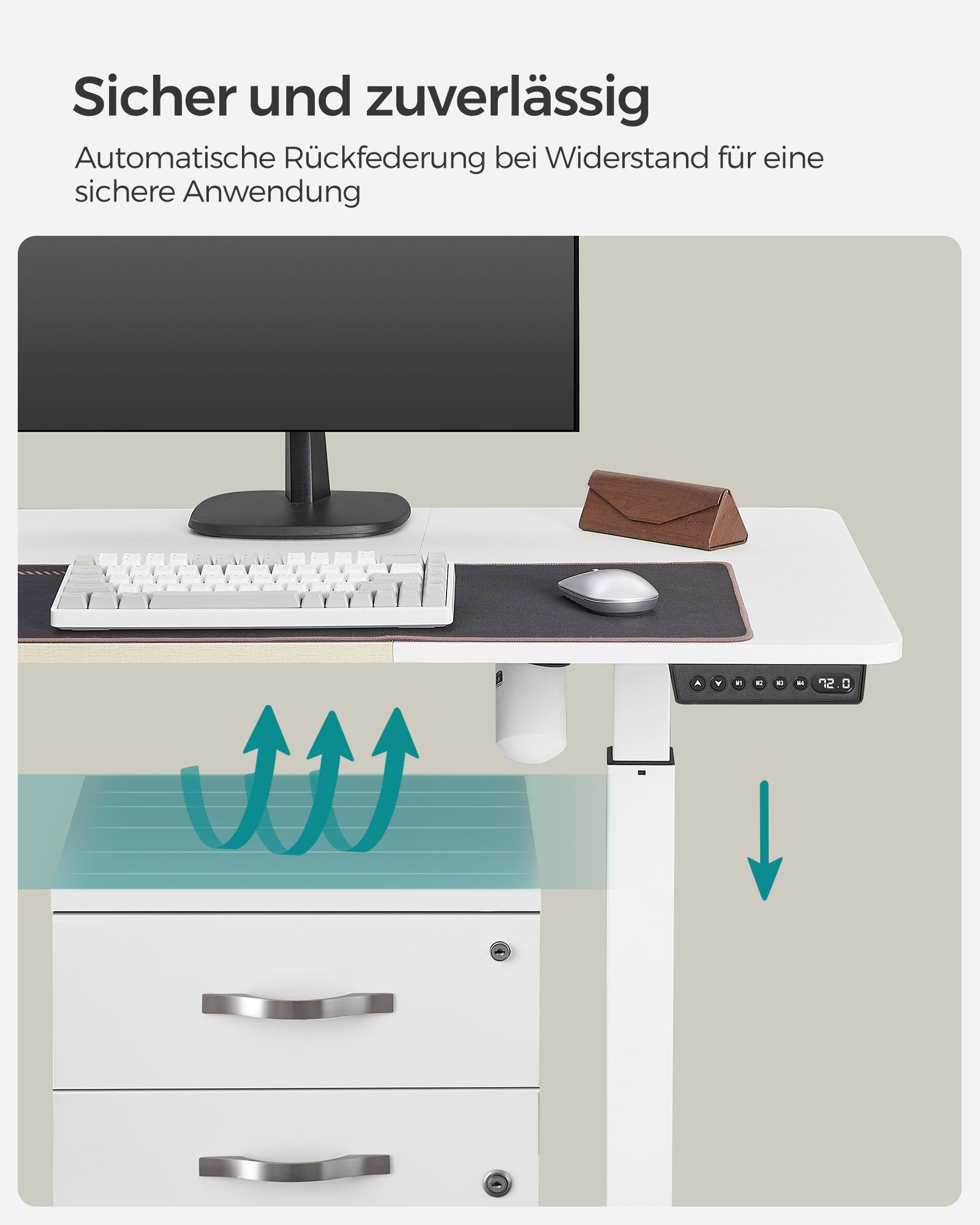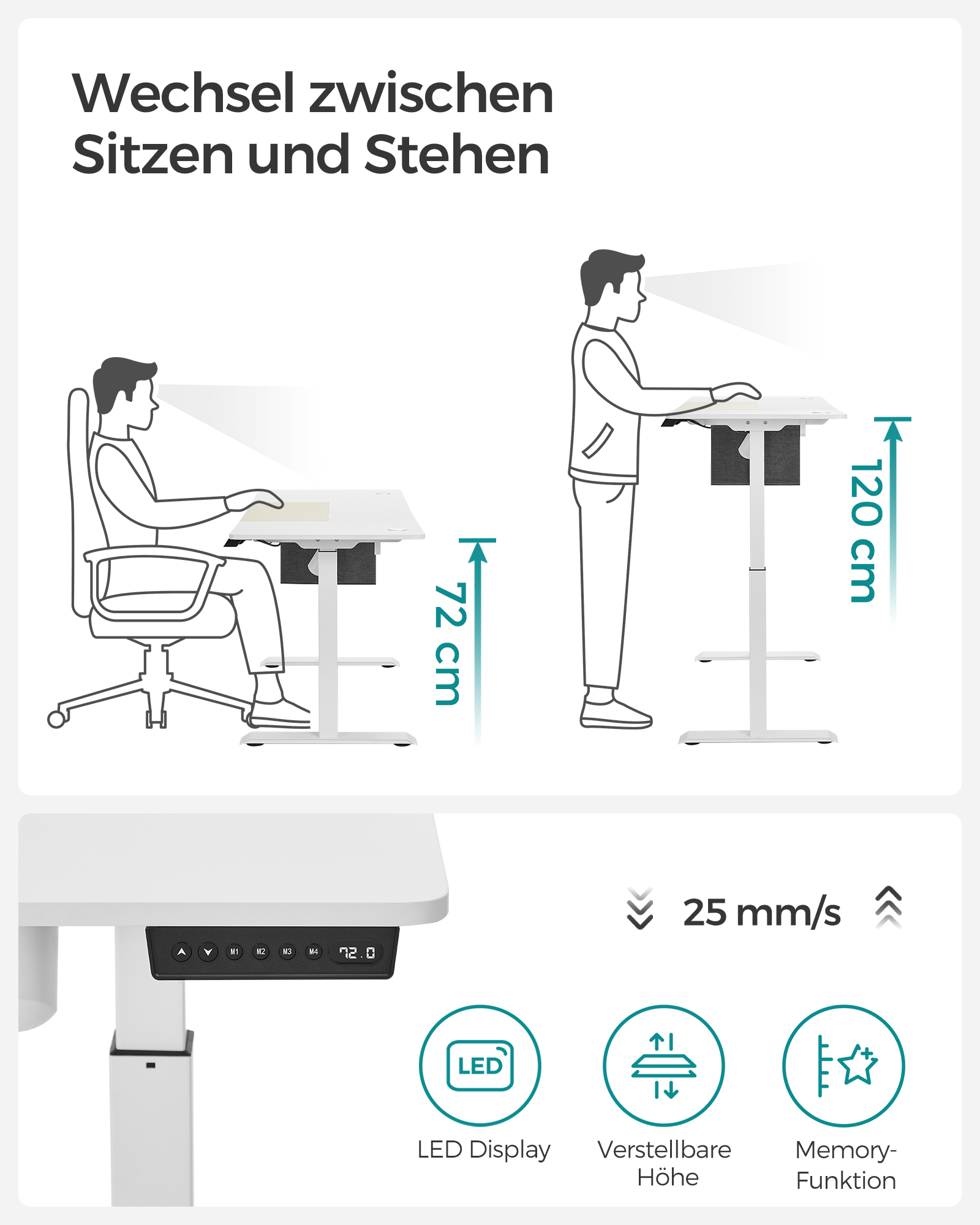 Hvid hæve sænkebord hvor du kan justere højden på det elektriske skrivebord mellem 72 og 120 cm og gemme 4 foretrukne højder.