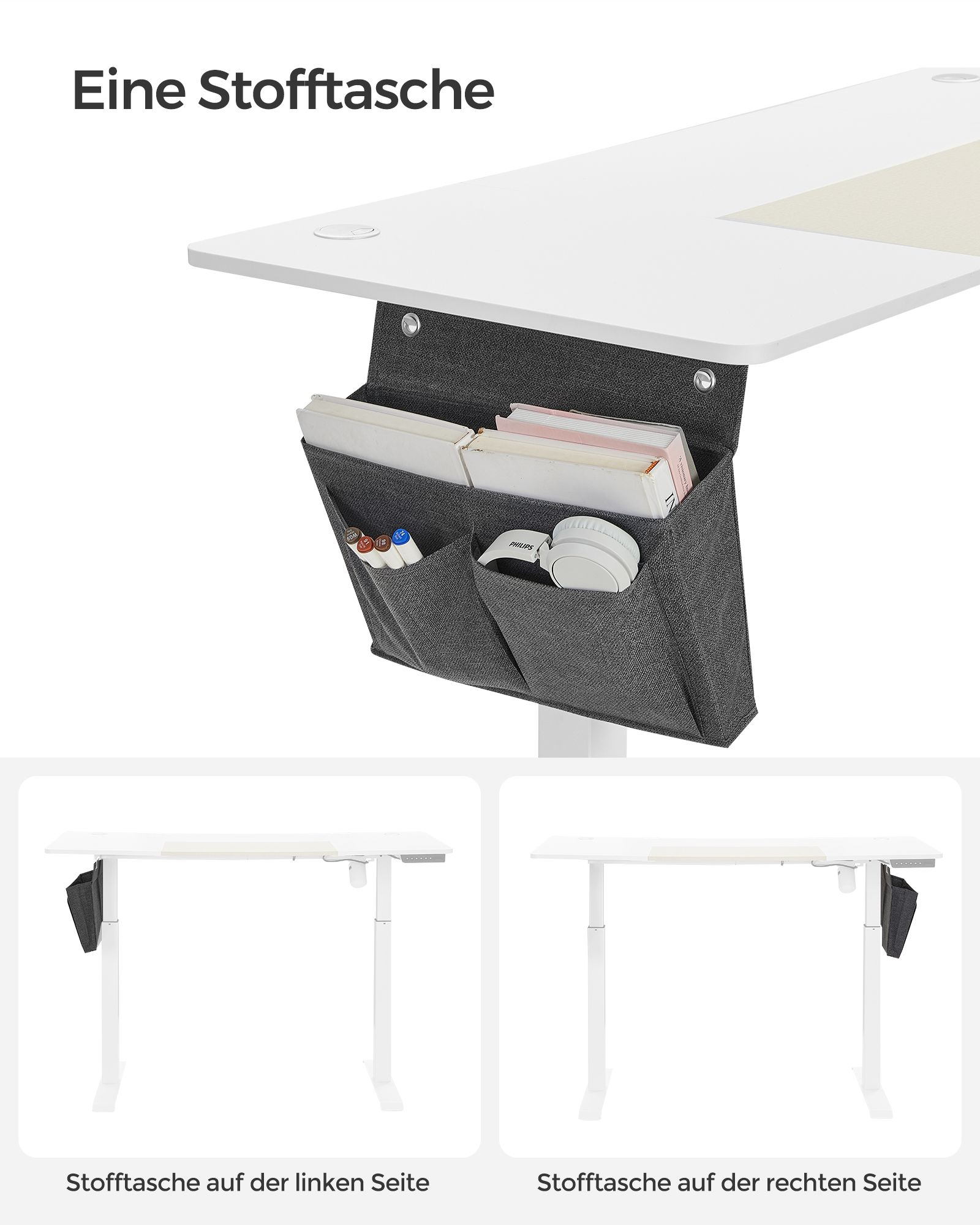 Hold orden på kontoret med dette elektriske hæve sænkebord. Stoflomme i venstre eller højre side til bøger, magasiner og mere, 2 kroge til hovedtelefoner og tasker. Intet fremmer din koncentration mere end et ryddeligt skrivebord.