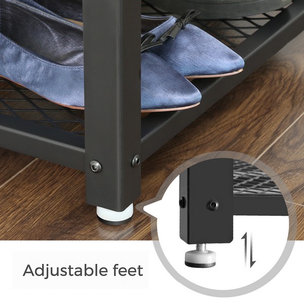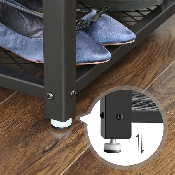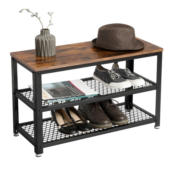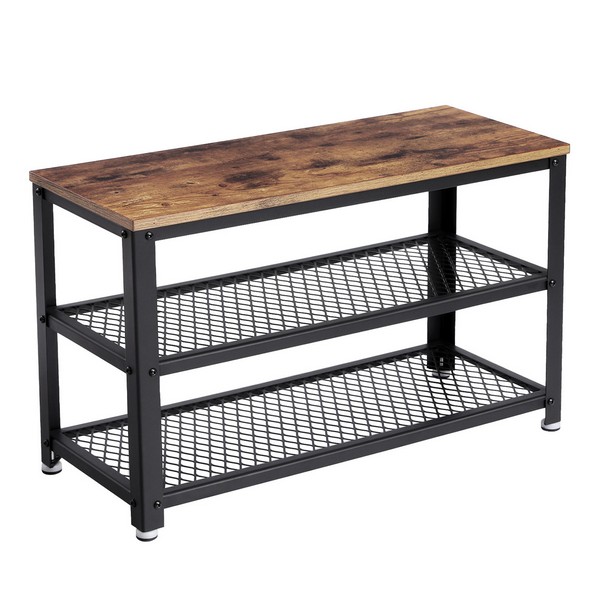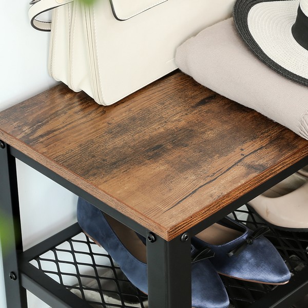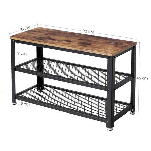 Denne praktiske og smarte rustik brune entrebænk med træsæde, trådhylder og justerbare ben er en velegnet entrebænk med 2 skohylder til sko og kan anvendes som skobænk og siddebænk, mens man tager sine sko af og på eller venter på, at andre gøre sig klar. Den rustik brune siddebænk med træsæde og entrebænkens 2 skohylder, skaber orden i entreen.