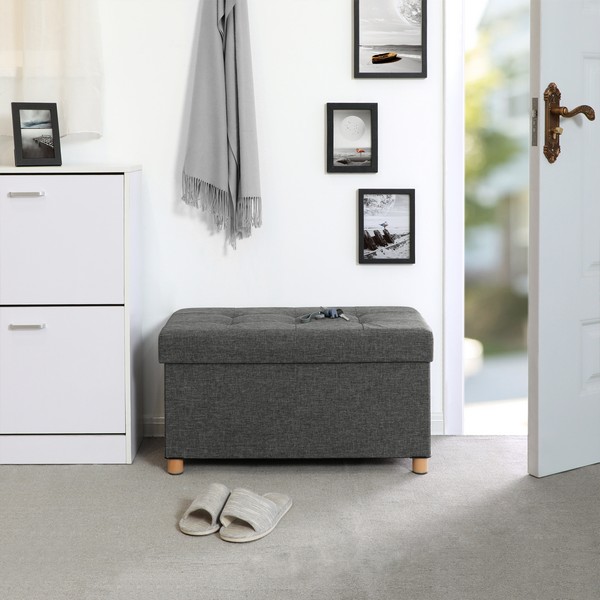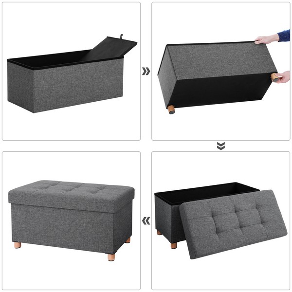 Siddebænk - foldbar bænk med kiste til opbevaring 76 x 38 x 38 - opbevaringskiste på træben i mørkegrå stof med opbevaringsplads
