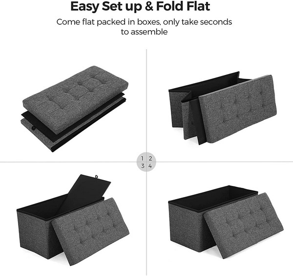 I stedet for at købe en anden sofa til ekstra siddeplads eller en ny garderobe for mere opbevaringsplads, kan du slå to fluer med et smæk med denne pladsbesparende siddebænk. Hvad skal man gøre med denne bænk med kiste? Den kan anvendes som skammel overfor sofaen i stuen, som bænk med kiste for enden af din seng i soveværelset, som bænk med kiste i entreen eller som opbevaringsplads til legetøj i børneværelset, Kun din fantasi sætter grænsen. Hvis du ikke ønsker at bruge den længere, kan du nemt folde den sammen og blot opbevare den under din seng eller på en hylde. Når den skal bruges, kan den nemt foldes ud og du har 80 L til opbevaring af sengetøj, dvd'er, bøger eller tøj.