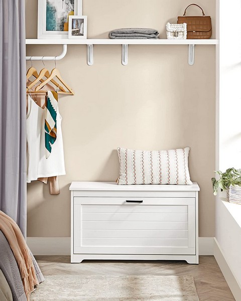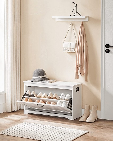 Læg dit skotøj i denne hvide skobænk med skohylder, hvor der er plads til 6-8 par sko i skoskabet, så din entre altid er pæn og ryddelig for skotøj.