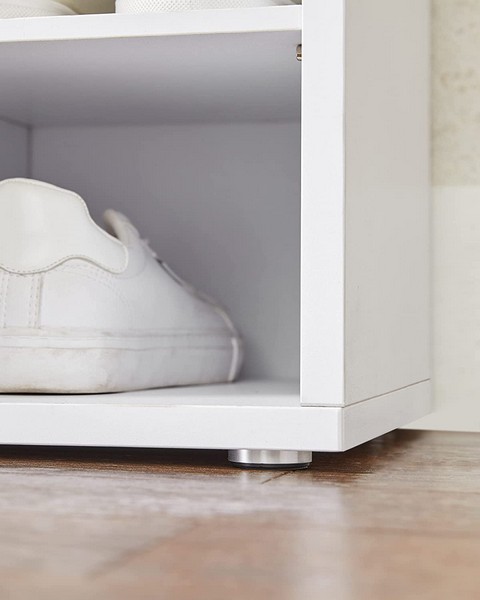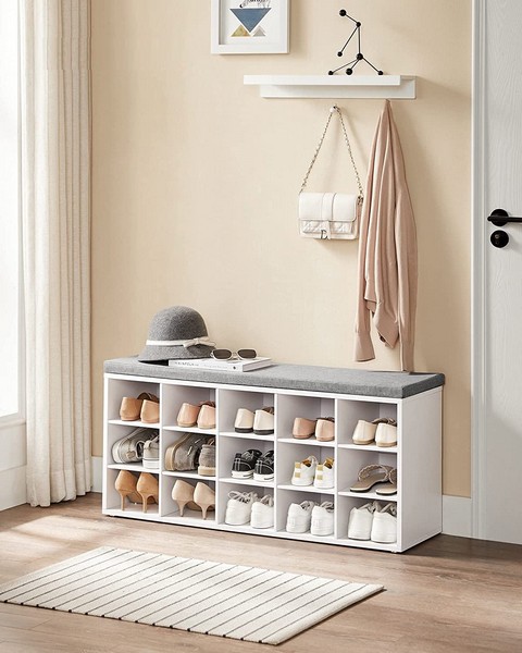 Denne praktiske og smarte hvide entrebænk med hynde og skohylder er en velegnet entrebænk med 15 skorum til sko og kan anvendes som skobænk og siddebænk, mens man tager sine sko af og på og man kan aflægge sine sko i siddebænkens 15 skorum. Den hvide siddebænk med skohylder og entrebænkens 15 skorum, skaber orden i entreen. Entrebænken har hynde og skohylder. Denne skobænk med hylder til sko og opbevaringsplads på hylderne og skobænkens 15 skorum, afhjælper dagligdagens udfordringer med rod i entreen.