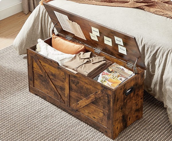 Den rustik brune siddebænk med opbevaring skaber orden i entreen. Entrebænken har plads til opbevaring i opbevaringskisten under låget.