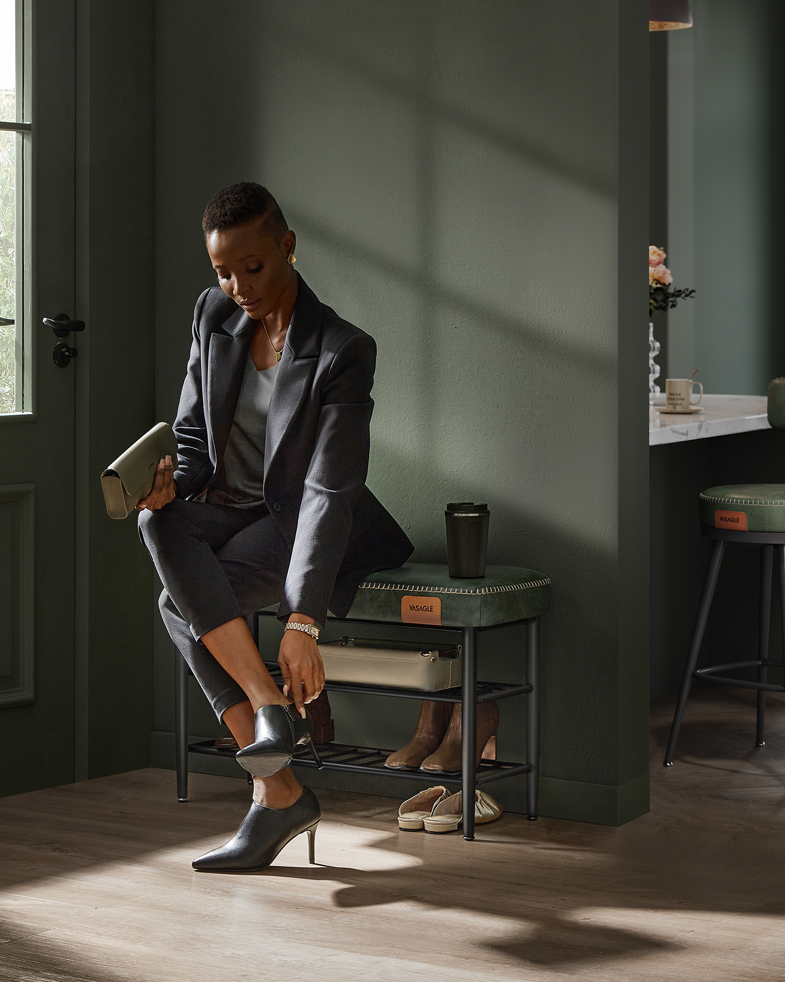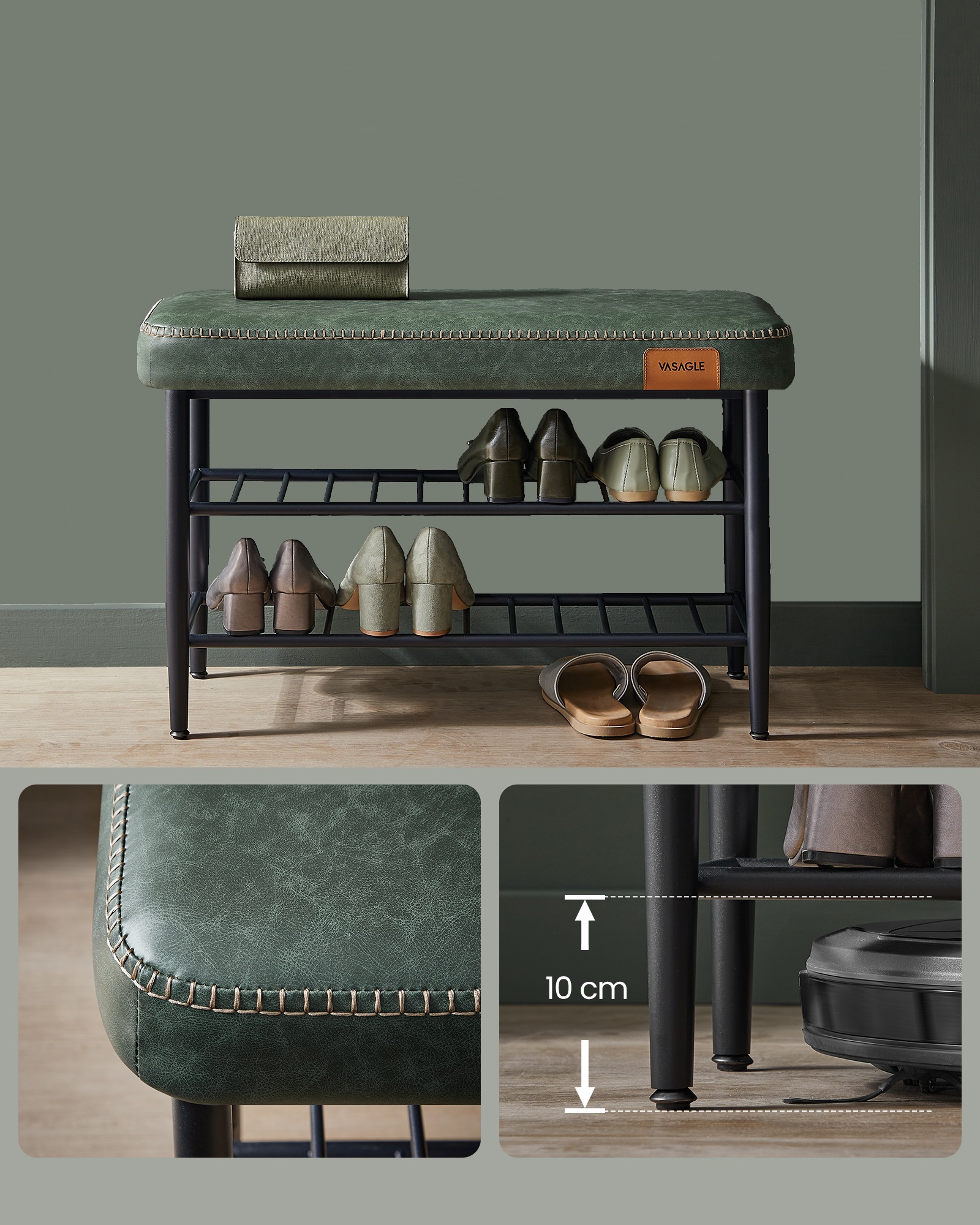Oplev denne flotte opbevaringsbænk med 2 hylder til opbevaring af sko, hvor grøn syntetisk kunstlæder møder raffinerede syninger. Opbevaringsbænkens subtile buede kanter prioriterer sikkerhed, mens det slanke sorte metal stel med hylder skaber en luftig følelse.