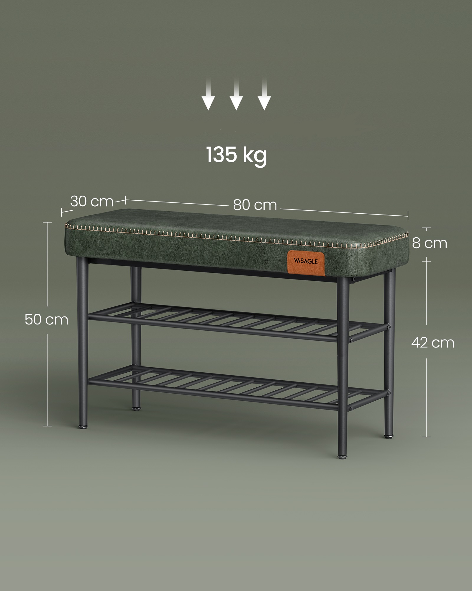Specifikationer - opbevaringsbænk - siddebænk med 2 hylder - entrebænk med skohylder - bænk med grøn kunstlæder 30 x 80 x 50 cm: