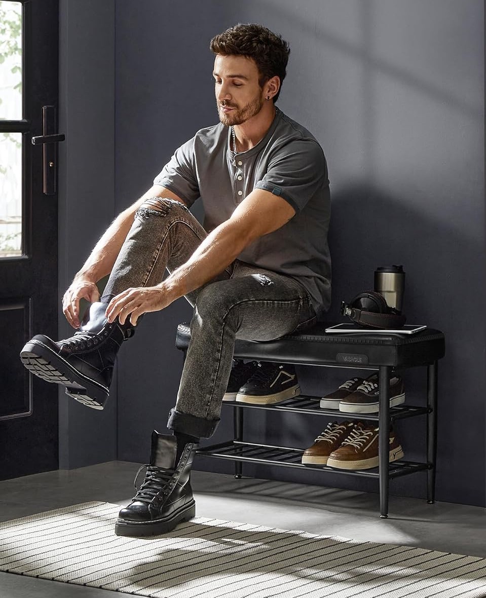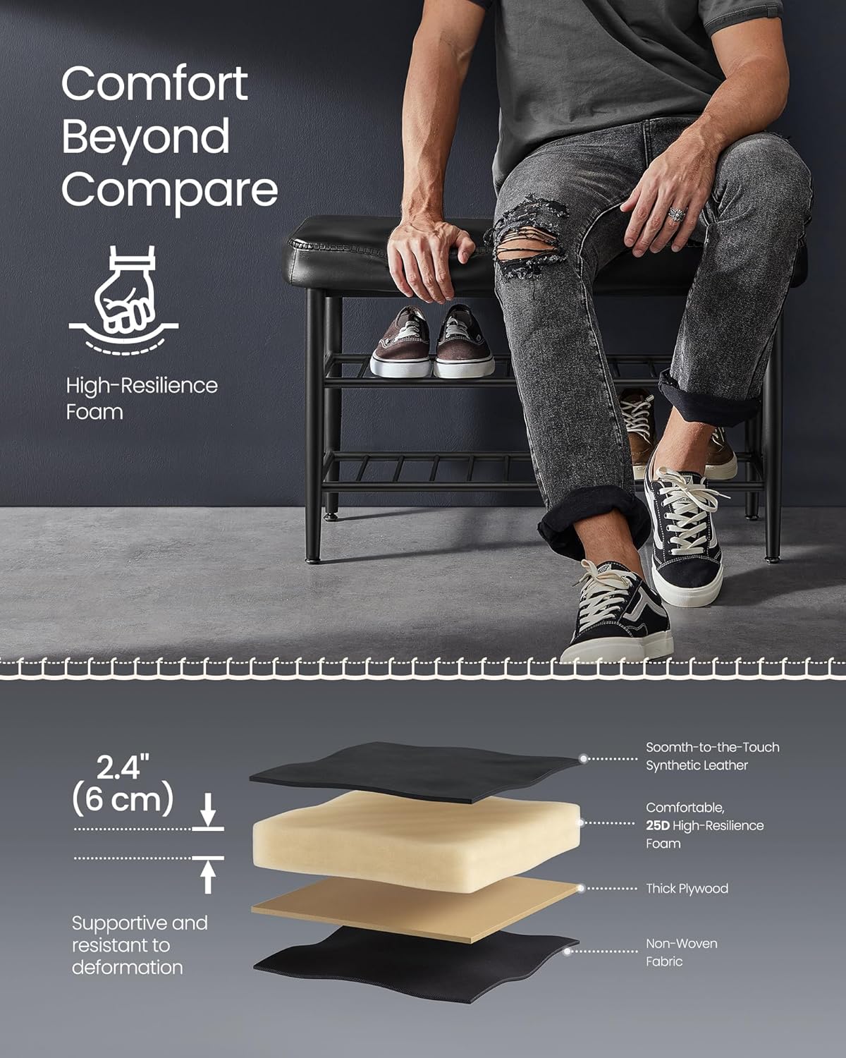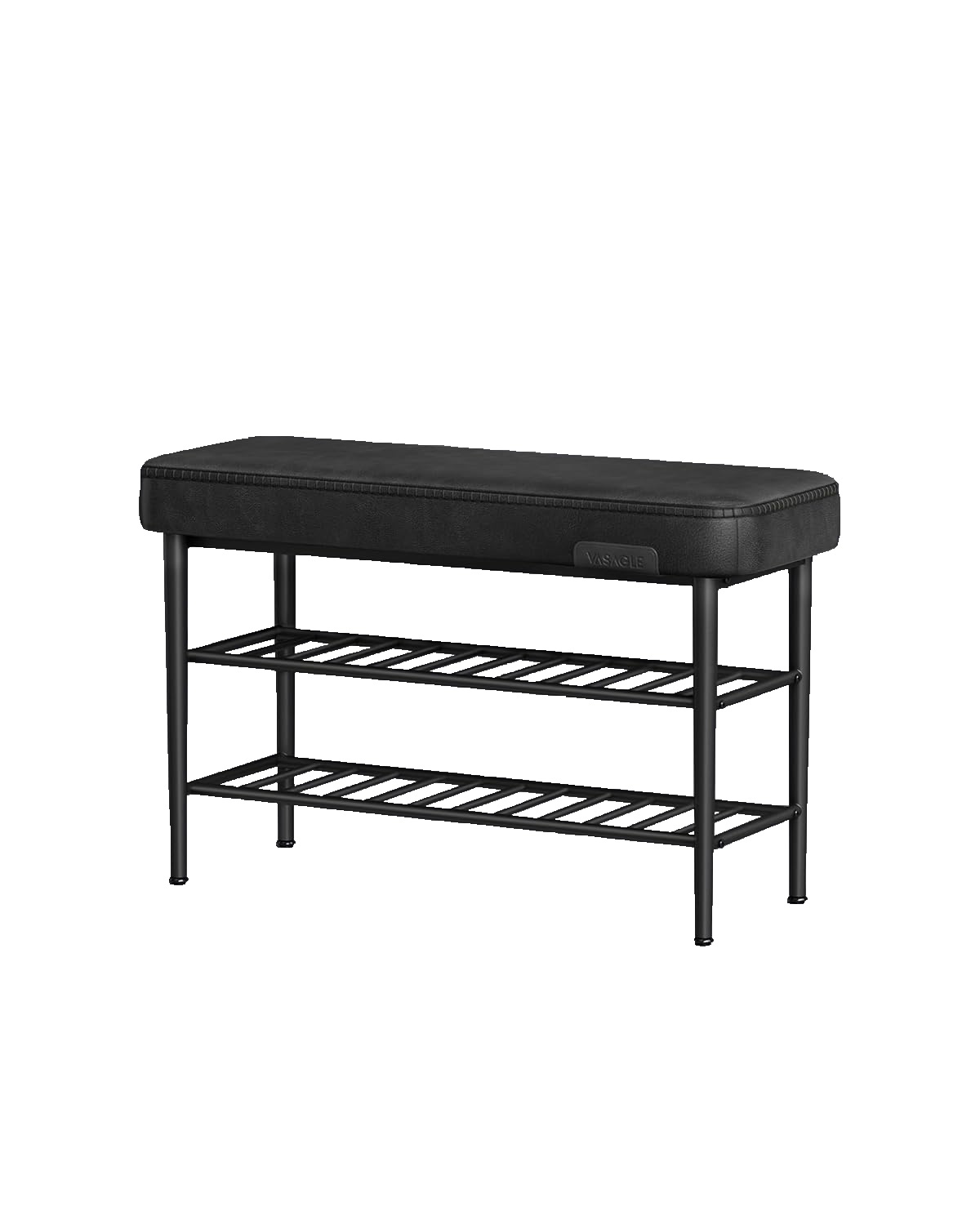 Oplev denne flotte opbevaringsbænk med 2 hylder til opbevaring af sko, hvor sort syntetisk kunstlæder møder raffinerede syninger. Opbevaringsbænkens subtile buede kanter prioriterer sikkerhed, mens det slanke sorte metal stel med hylder skaber en luftig følelse.