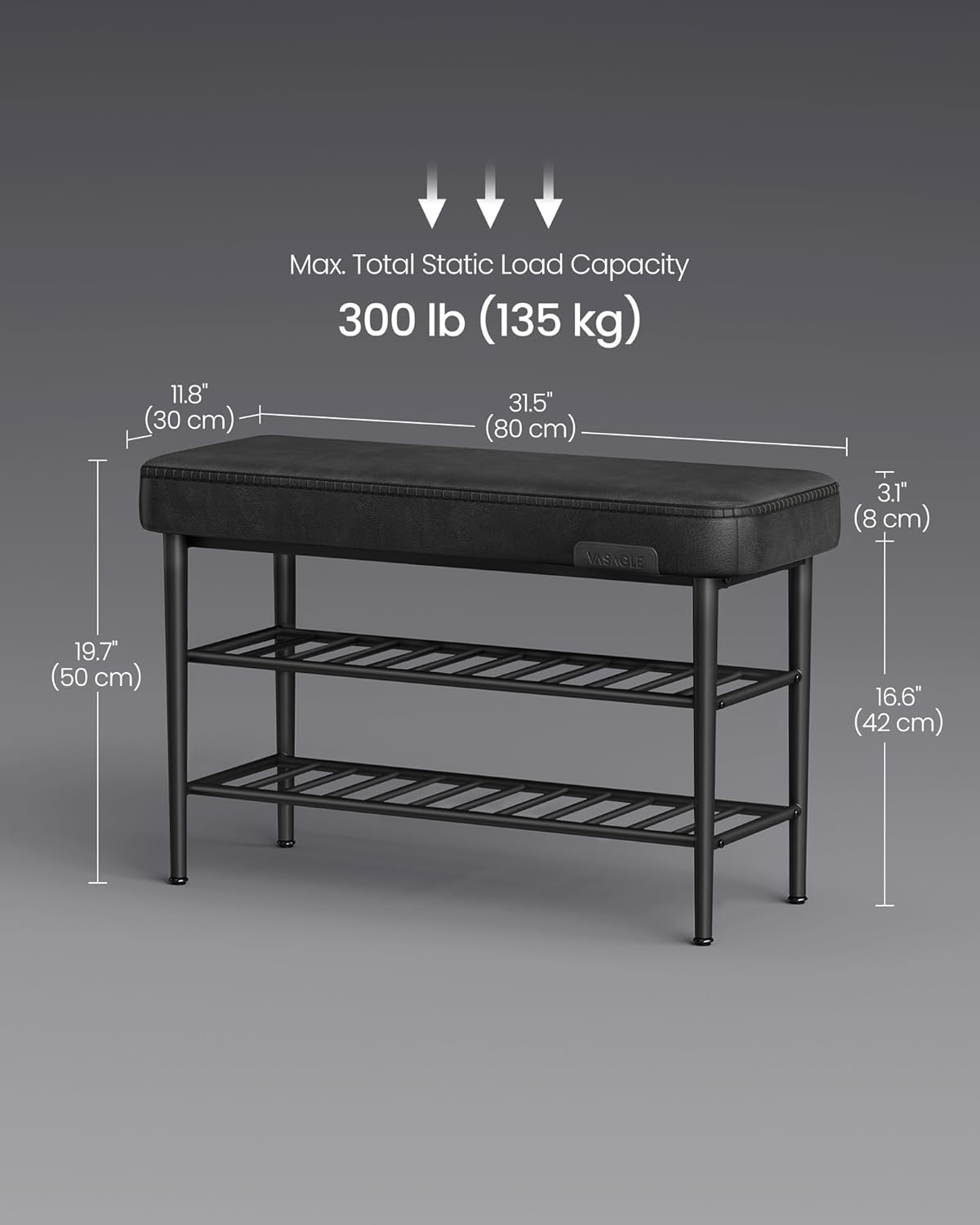 Specifikationer - opbevaringsbænk - siddebænk med 2 hylder - entrebænk med skohylder - bænk med sort kunstlæder 30 x 80 x 50 cm: