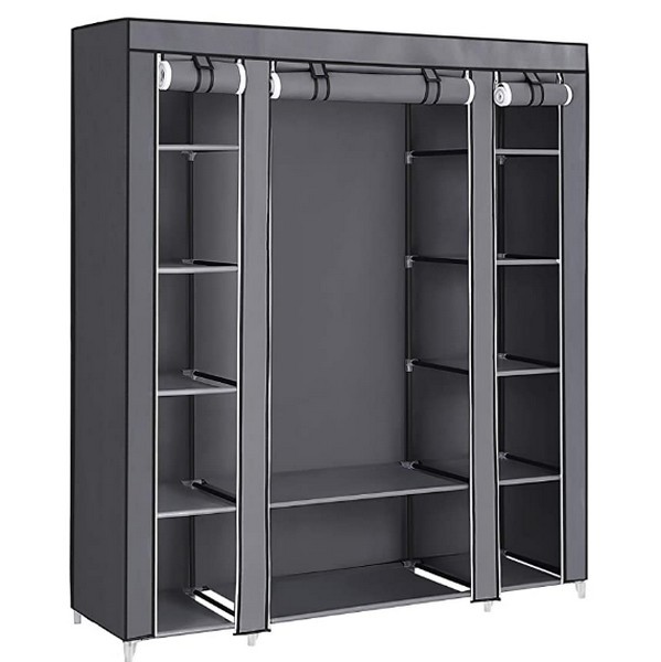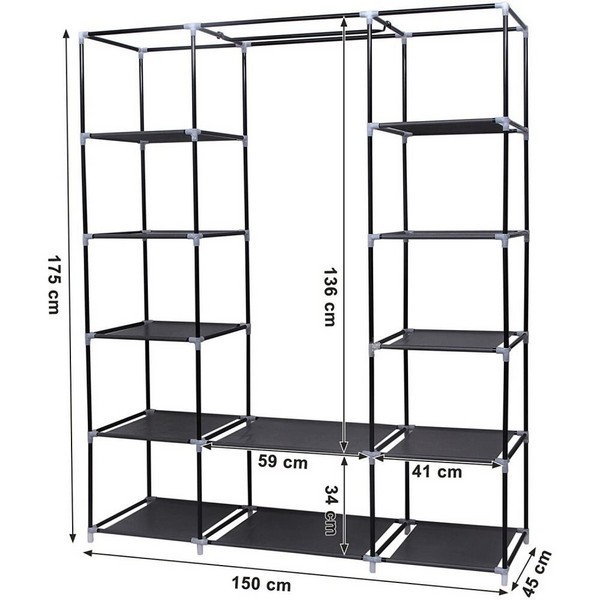 Klædeskab i grå stof med robust og holdbar konstruktion. Garderobeskabet er lavet af stofbetræk, vandtætte stoflag, højkvalitets stålrør og plastikforbindelser, hvilket gør tøjskabet let og mobilt, så garderoben opfylde de fleste behov - er også velegnet til campingturen, som f.eks. klædeskab i forteltet.