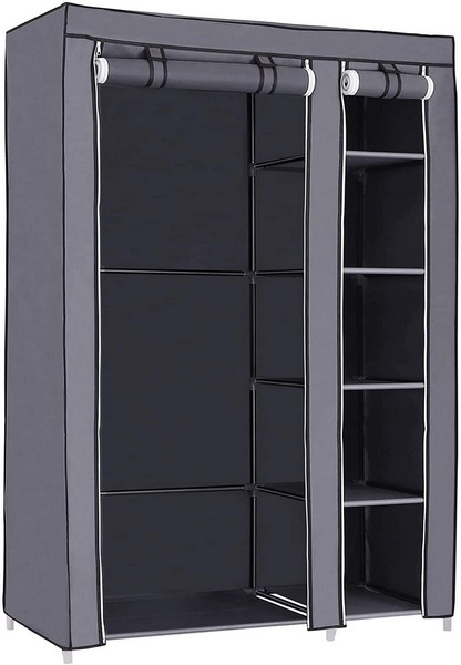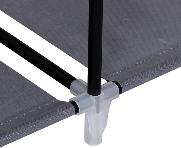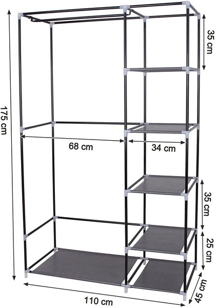 Klædeskab i grå stof med robust og holdbar konstruktion. Garderobeskabet er lavet af stofbetræk, vandtætte stoflag, højkvalitets stålrør og plastikforbindelser, hvilket gør tøjskabet let og mobilt, så garderoben opfylde de fleste behov - er også velegnet til campingturen, som f.eks. klædeskab i forteltet.
