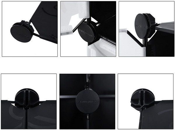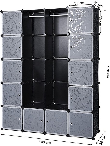 Modulært reolsystem med 2 bøjler og 12 kubiske rum på 35x35x35 cm, velegnet til f.eks. garderobe, bogreol, skoreol og anden opbevaring - inkluderet anti-væltebeslag og gummihammer til samling af opbevarings systemet. Sort reolsystem med halv gennemsigtig låger på de 12 skorum.