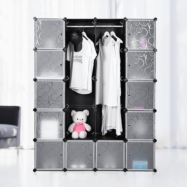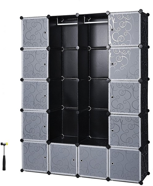 Reolsystem med 2 bøjler og 12 rum - kubisk garderobe i plastik - opbevaringssystem - sort