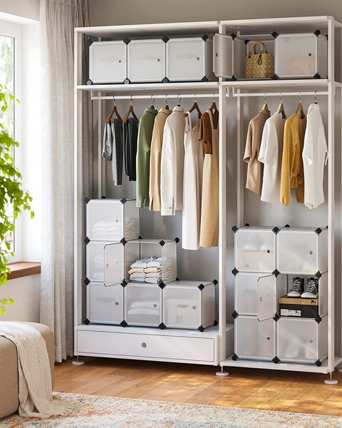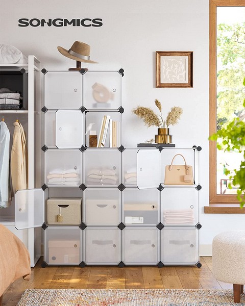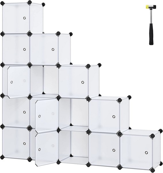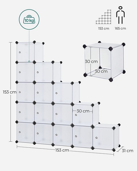 Modulært skab system med 16 kubiske rum velegnet til f.eks. legetøj, tøj, som skoskab, bogreol, skoreol eller anden opbevaring - inkluderet anti-væltebeslag og gummihammer til samling af opbevaringsskabet. Semi-transparent reol system med 16 rum og hvert rum kan opbevare op til 10 kg tøj eller sko.