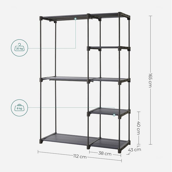 Stabilt åbent klædeskab med tøjstænger. Denne åben garderobe er understøttet af 4 forstærkede metalrør (diameter 16 mm). Med solide plastikforbindelser kan hver stofhylde i garderobeskabet holde op til 8 kg. Hver bøjlestang i garderobeskabet kan holde op til 20 kg. Et stabilt garderobeskab med tøjstativ til dit tøj.