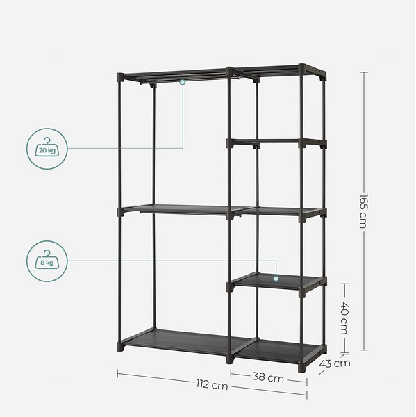 Åben klædeskab med masser af opbevaringsplads på skohylder, stofhylder og bøjlestænger. Med en størrelse på 112 x 43 x 165 cm og tøjstænger, skohylder og stofhylder, tilbyder denne åbne garderobe masser af plads til at hænge tøj på, mange hylder til sko og foldet tøj og andet tilbehør.