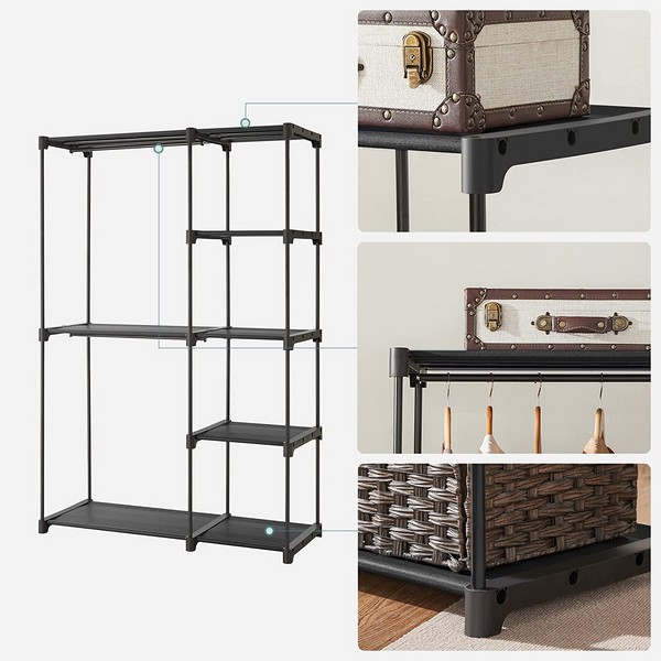 Åbent klædeskab med hylder og bøjlestænger - åben garderobe med tøjstænger og skohylder - garderobeskab og tøjskab med stofhylder - sort tøjstativ 112 x 43 x 165 cm