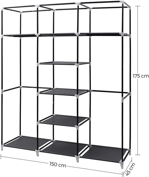 Rummeligt sort garderobeskab i stor størrelse på H 175 x B 150 x D 45 cm, med tøjstang og 9 opbevaringshylder, som giver dig ekstra plads til dine længere outfits og sammenfoldede tøj.