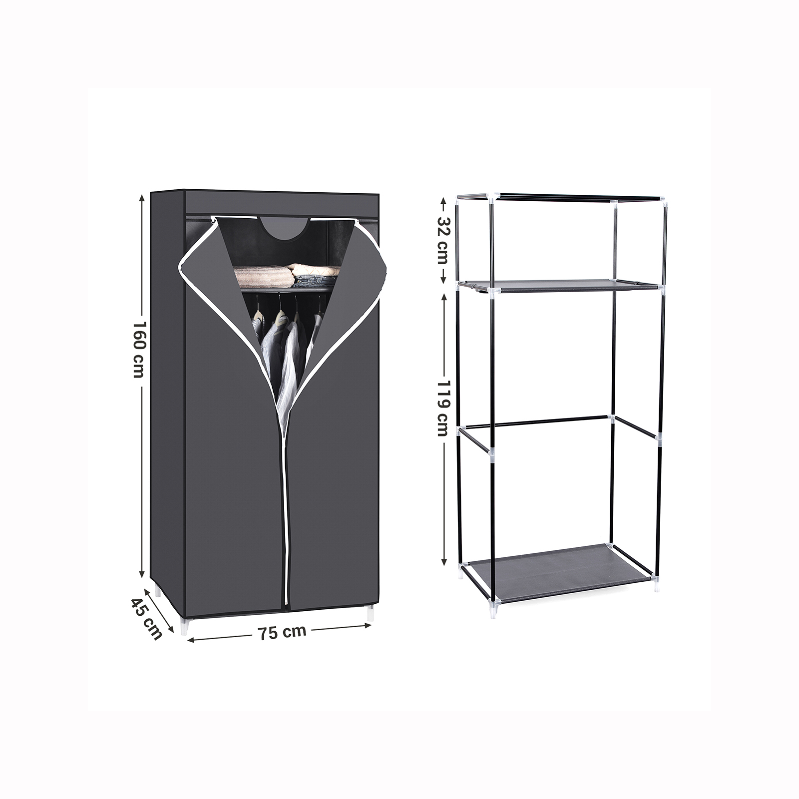 Klædeskab i grå stof med robust og holdbar konstruktion med forskellige monteringsmuligheder, så den kan tilpasse til den perfekte opbevaringsløsning for dig.