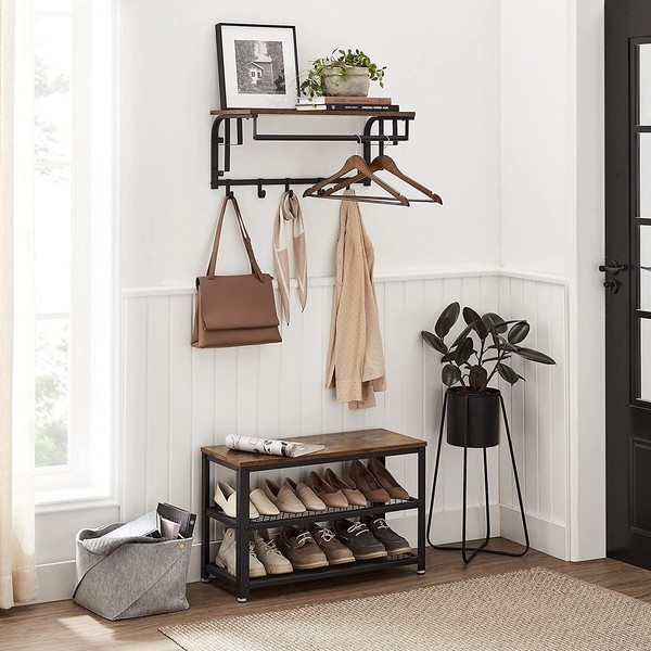 Hattehylde - entremøbel med bøjlestang, 5 knager og hylde - rustik brun knagerække med tøjstang til garderoben