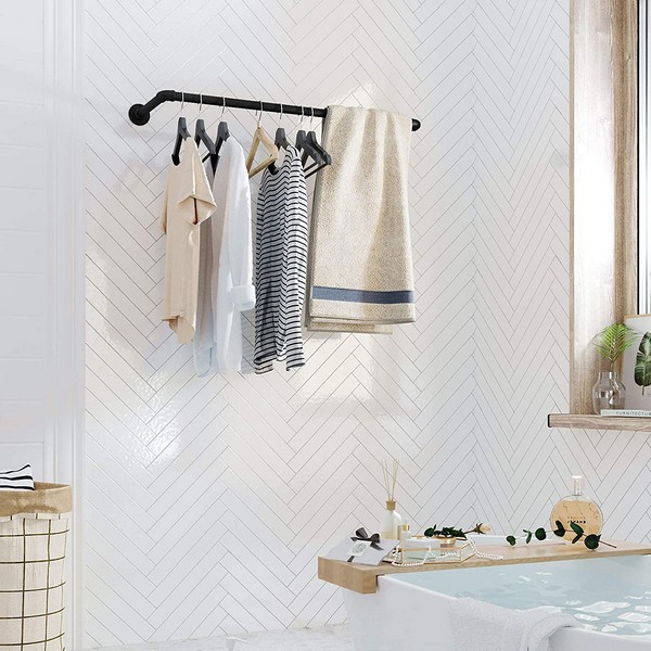 Væghængt tøjstativ i vandrør look med en afstand på 30 cm mellem væggen og tøjstangen, hvilket giver plads nok til de fleste bøjler og tøj, så dit tøj på bøjlestangen ikke bliver slidt af den hvide væg, når det hænger på tøjstangen.