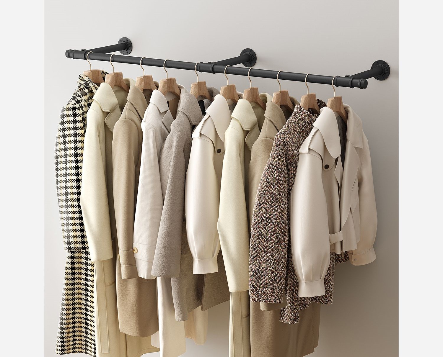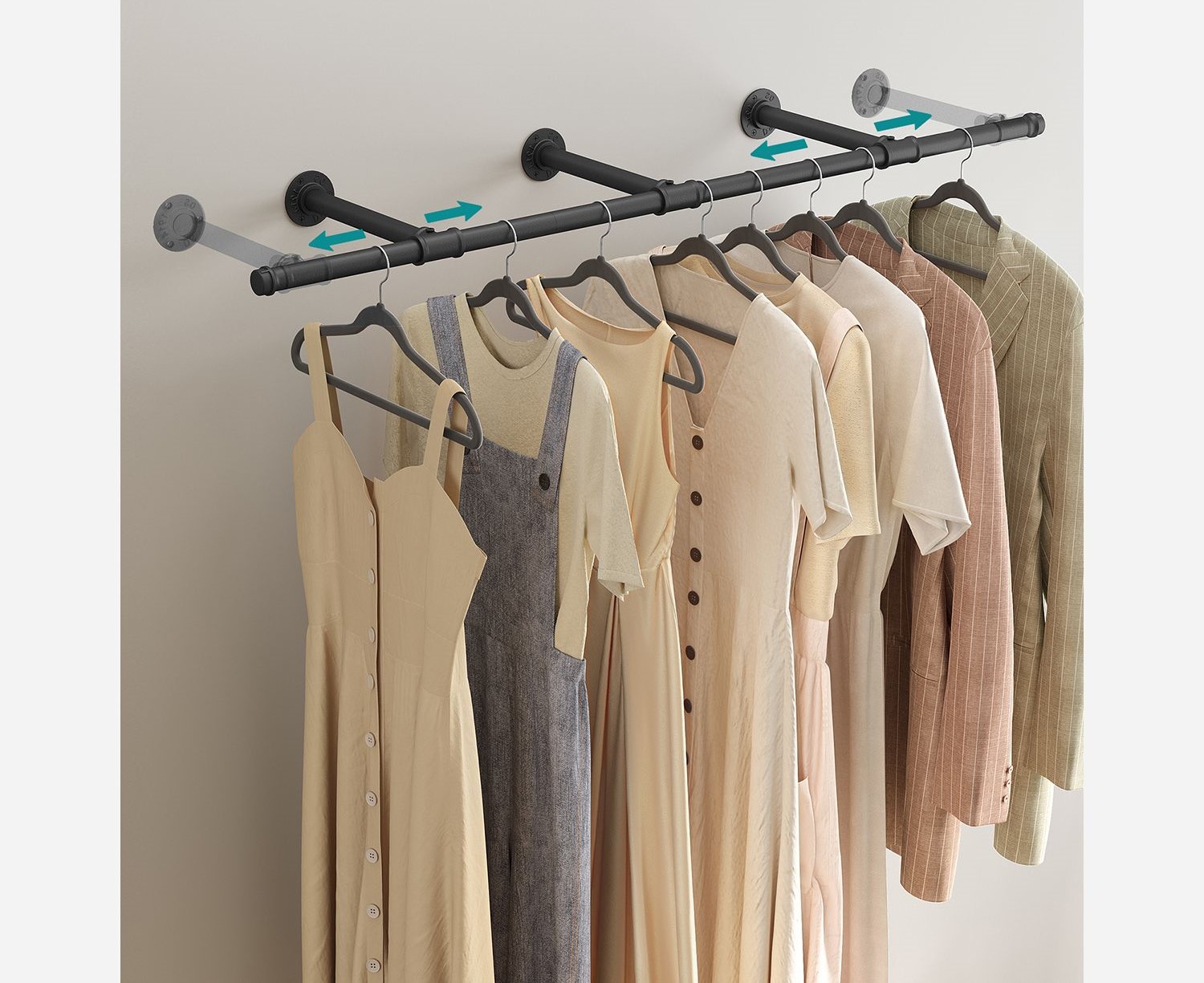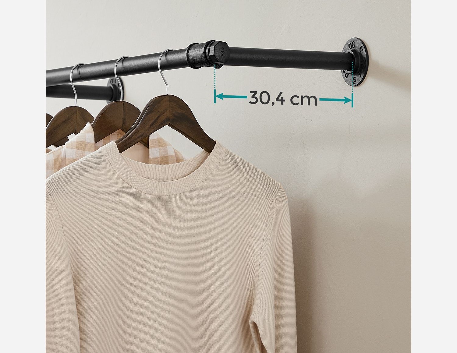 Med tøjstangen elegante industrielle design og vandrør look, passer denne vægmonteret bøjlestang ind i de fleste entreer. Afstanden mellem beslagene kan justeres så du også kan montere tøjstangen på en ribbet væg.
