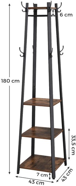 Stumtjener med 4 arme - frakke stativ i sort metal med 8 kroge og 3 firkantet rustik brune hylder - 180 x 43 x 43 cm