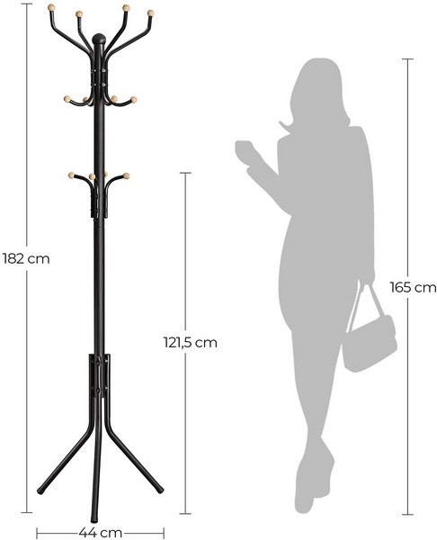 Så mangler du en stumtjener til entreen! Takket være de 12 knager giver den masser af plads til at hænge tøj og tilbehør op. Krogene er udstyret med kuglehoveder, som beskytter dit tøj og tørklæder mod ridser. Takket være de forstærkede fødder er den også meget stabil. Frakke stativet kan hurtigt sættes op takket være de præfabrikerede skruehuller og den illustrerede monteringsvejledning, som er enkel og forståelig, og den fylder også lidt (Ø 44 cm; højde: 182 cm). Den er nem at flytte og kan placeres hvor som helst.