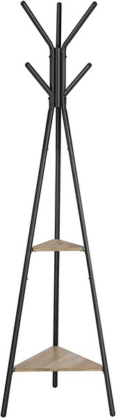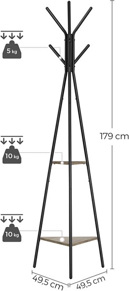Stumtjener med 6 arme - frakke stativ i sort metal med 2 trekantet grå beige (greige) hylder - 179 x 49,5 x 49,5 cm