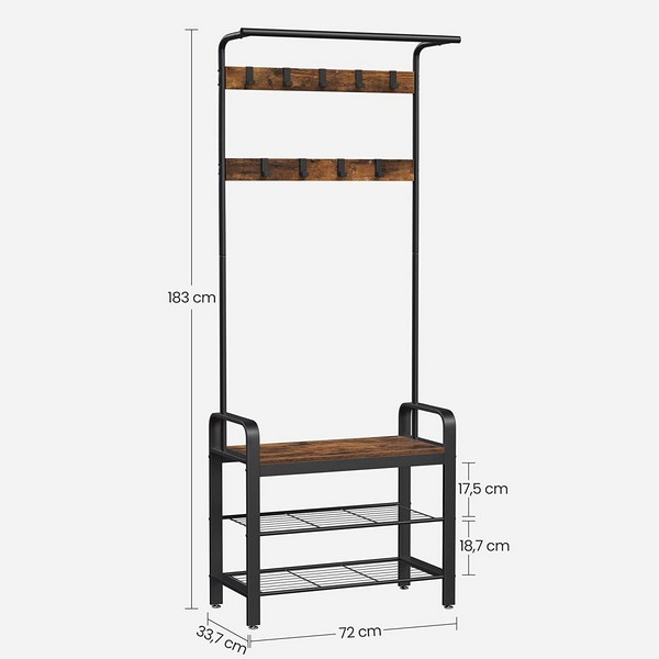 Garderobestativ med tøjstativ, bøjlestang, siddebænk, 2 knagerækker med 9 knager og 2 skohylder - rustik brun entremøbel - 183 x 33,7 x 72 cm