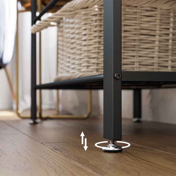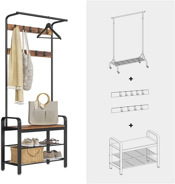 Garderobestativets rene linjer og enkle design i metal og rustik brun farve gør også garderoben med tøjstativ, bøjlestang og siddebænk med skohylder til et velegnet klædeskab, der passer perfekt til ethvert miljø, hvad enten det er i kælderen, på loftet, i soveværelset, entréen, opgangen, på værelset eller på kollegieværelset.