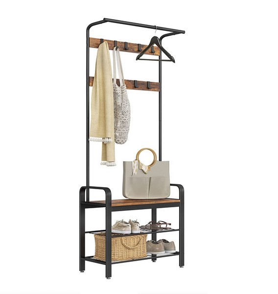 Her præsenteres et rustik brun garderobestativ med 4 højdejusterbare fødder, tøjstativ, bøjlestang, siddebænk, 2 knagerækker med 9 knager og 2 skohylder. Garderobestativet giver åben tøjopbevaring som entremøbel, hvilket gør det nemt og overskueligt for f.eks. gæster at finde sit overtøj. Dette rustik brune entremøblet kan også bruges som åbent klædeskab i soveværelset eller på værelset, ligesom garderobestativet kan være velegnet som garderobe med skohylder, knager eller siddeplads på f.eks. en wellness klinik eller andre steder, hvor man jævnligt skal have overtøj og skoene af og på.