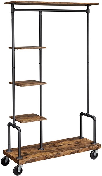 Smukt rustik brun stativ i industrielt design med hylder, hjul og bøjlestang/tøjstang. Enkelt, elegant, delikat og udsøgt tøjstativ med tøjstang og hylder til at opbevare eller fremvise tøj.