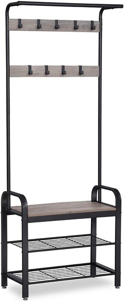 Garderobestativ med tøjstativ, bøjlestang, siddebænk, 2 knagerækker med 9 knager og 2 skohylder - grå beige (greige) entremøbel - 183 x 33,7 x 72 cm