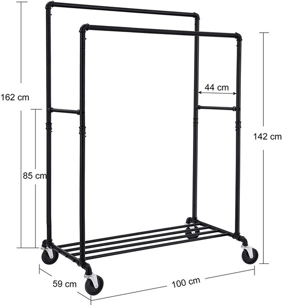 Tøjstativ i vandrør look i industrielt design - garderobestativ med hjul, skohylde og dobbelt tøjstang/bøjlestang - bæreevne 110 kg - sort 100 x 59 x 146/162 cm