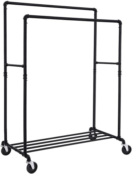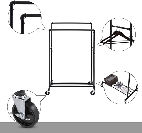 Garderobestativet i industrielt design med dobbelt bøjlestang kan bruges derhjemme privat eller til kommerciel udstilling og brug.