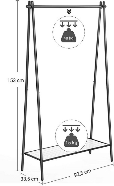 Tøjstativ med bøjlestang og hylde i sort metal - tøjstang med skohylde - 153 x 33,5 x 92,5 cm: