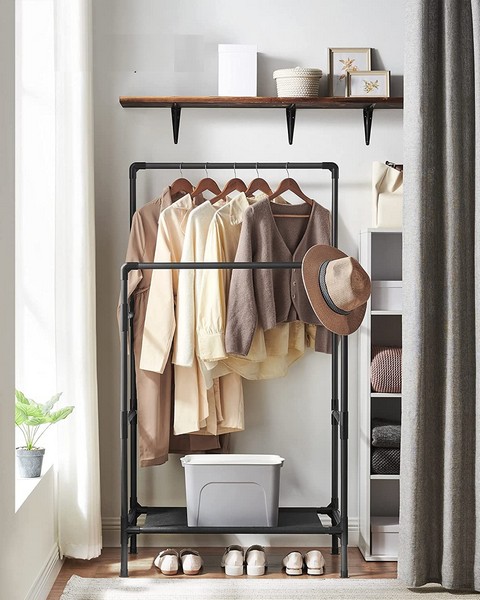 Sort tøjstativ i industrielt design med dobbelt bøjlestang til bl.a. skjorter, trøjer, jakker og lange frakker. Hæng gerne det tøj, du har brug for hele sæsonen. Nederste hylde mellem stellet i vandrør look, er velegnet som skohylde til skotøj, skotøjsæsker eller anden opbevaring.