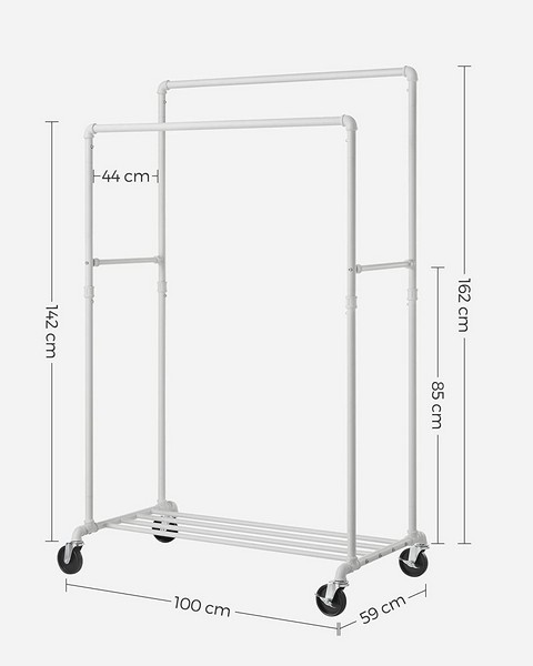 Tøjstativ i vandrør look i industrielt design - garderobestativ med hjul, skohylde og dobbelt tøjstang/bøjlestang - bæreevne 110 kg - hvid 100 x 59 x 146/162 cm