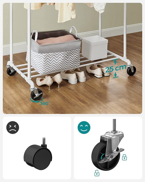 Dette tøjstativ med hjul har stabil struktur med en bæreevne på op til 110 kg.
