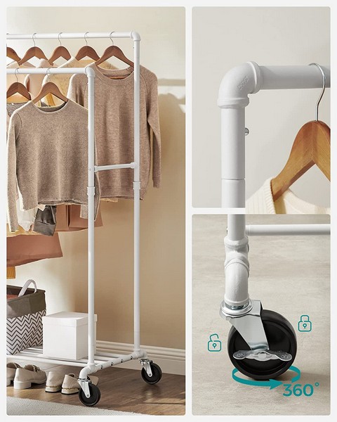 Garderobestativet i industrielt design med hvidt stel i vandrør look, har 4 hjul i høj kvalitet, som giver større og mere smidige bevægelse. 2 hjul har bremse, så tøjstativet kan fastlåses, når det ikke er i brug.