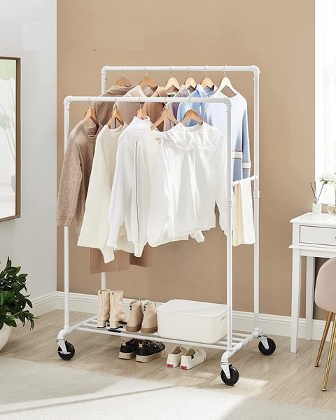 Hvid tøjstativ i industrielt design med hjul og dobbelt bøjlestang til bl.a. skjorter, trøjer, jakker og lange frakker. Hæng gerne det tøj, du har brug for hele sæsonen. Nederste skohylde mellem stellet i vandrør look er velegnet til skotøj og/eller skotøjsæsker.