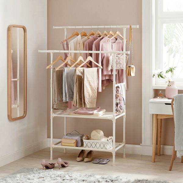 Hvidt tøjstativ i industrielt design med dobbelt bøjlestang til bl.a. skjorter, trøjer, jakker og lange frakker. Hæng gerne det tøj, du har brug for hele sæsonen. Nederste hylder mellem stellet er velegnet til skotøj, skotøjsæsker eller anden opbevaring.