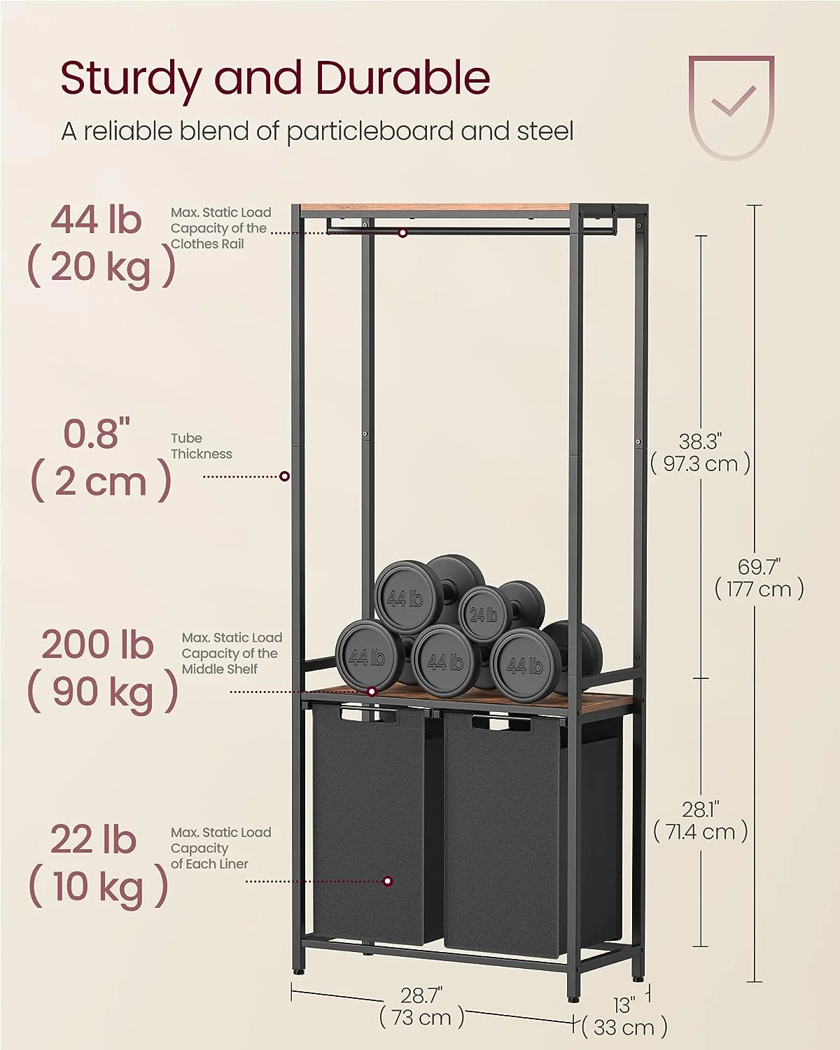 Kombinationen af robust sort metalramme, 2 rustik brune hylder og justerbare fødder giver tøjstativet høj stabilitet.