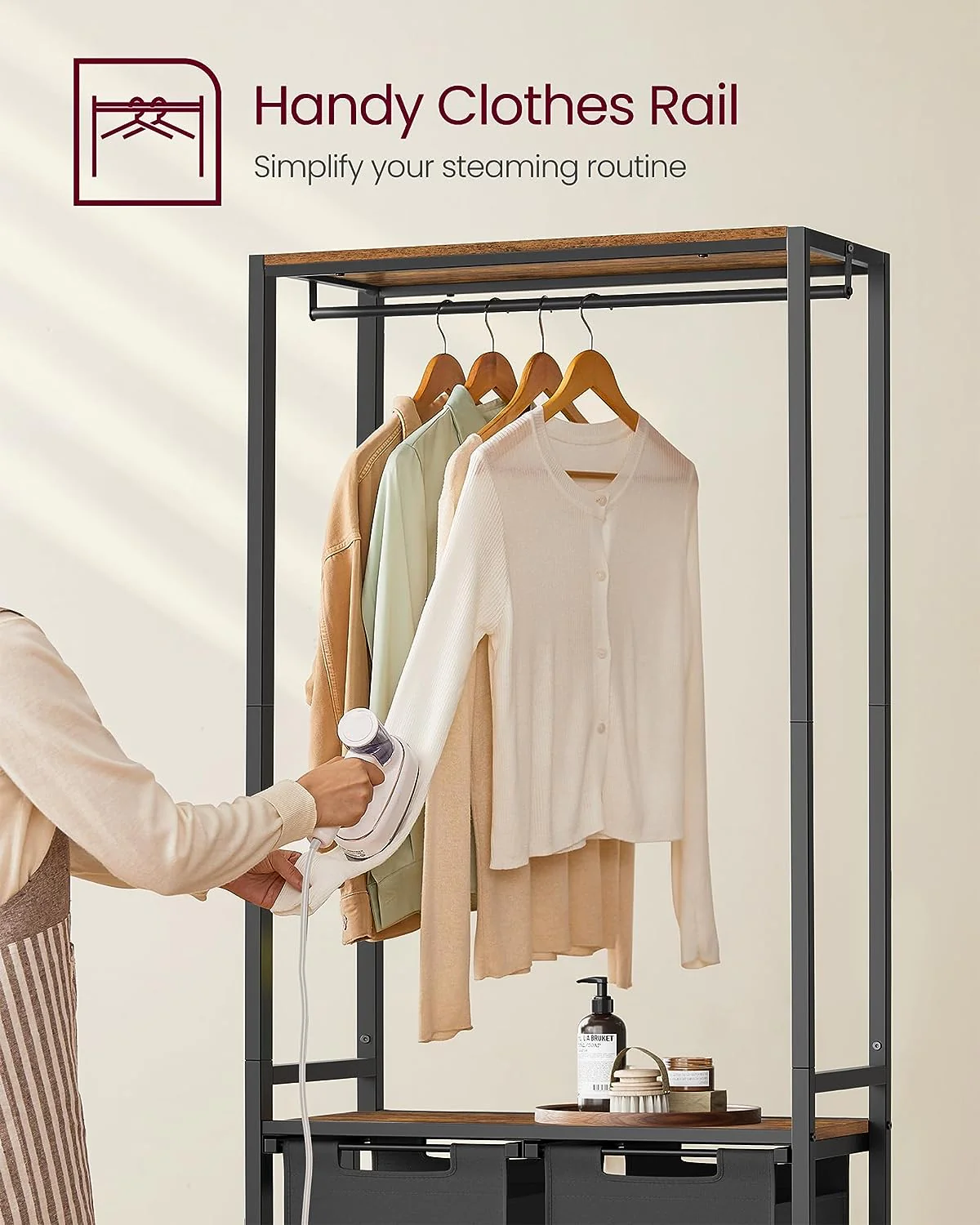 Dette tøjstativ med tørrestativ med bøjlestang har 2 sorte vasketøjskurve på i alt 92 liter, består af 2 vævede vasketøjsposer i sort Oxford stof, hver på 46 liter, som hjælper dig med at sortere vasketøj efter farve og 2 rustik brune hylder, så vaskemiddel og skyllemiddel er lige ved hånden samt 1 bøjlestang, som er velfungerende til at tørre skjorter mv. på.