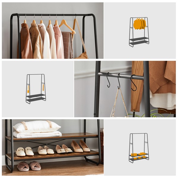 Super stabilt tøjstativ med sorte metalrør, bøjlestang, 2 skohylder og 6 S-kroge. Tøjstativ med tøjstang i sort og rustik brun industrielt design.