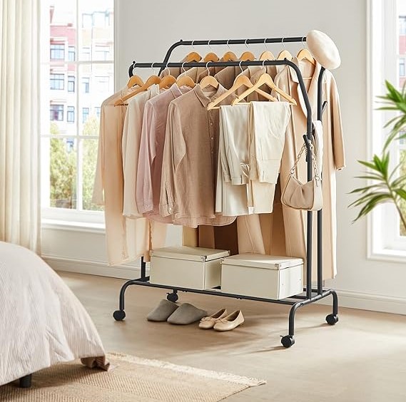 Flot og stilfuld sort tøjstativ i metalramme med hjul og skohylde, som gør denne dobbelte bøjlestang enkel og elegant. Dette sorte tøjstativ med dobbelt tøjskinne og hylde passer ind på de fleste værelser til opbevaring eller fremvisning af dit tøj.