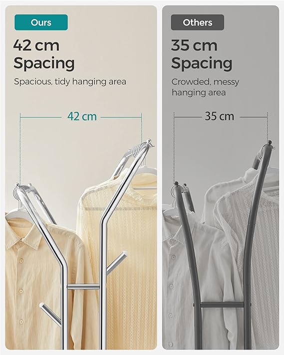 Tøjstativet i sølv kommer med en høj tøjskinne på 155 cm og en lavere tøjskinne 141 cm, til ophængning af tøj i forskellige længder, bøjlestangen kommer også med skohylde og kroge der kan bærer op til 5 kg. på begge sider af metalrammen til at hænge hatte og tasker på.