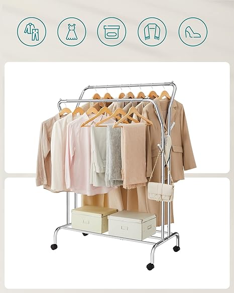 Flot og stilfuld sølv farvet tøjstativ i metalramme med hjul og skohylde, som gør denne dobbelte bøjlestang enkel og elegant. Dette sølv tøjstativ med dobbelt tøjskinne og hylde passer ind på de fleste værelser til opbevaring eller fremvisning af dit tøj.