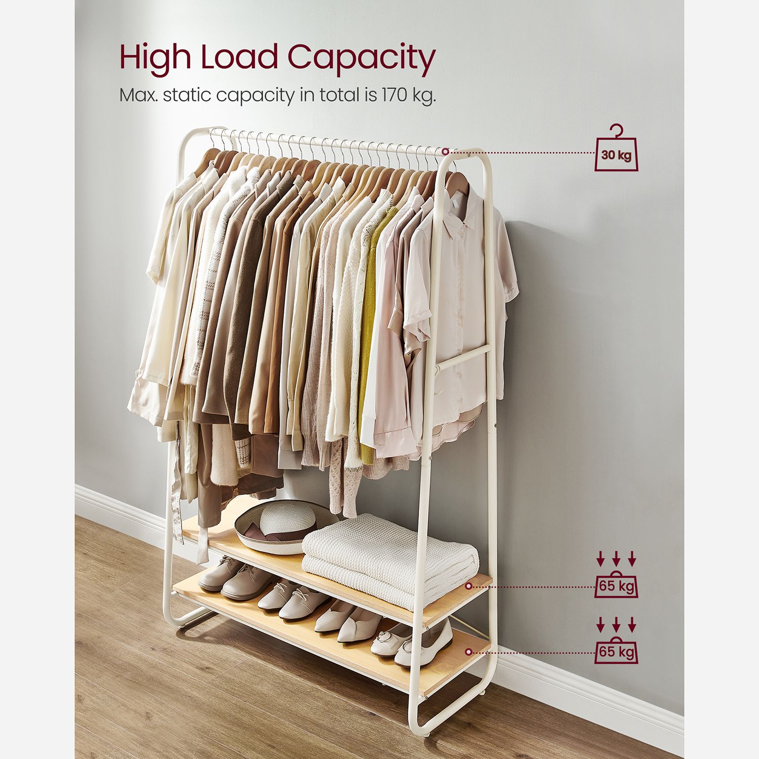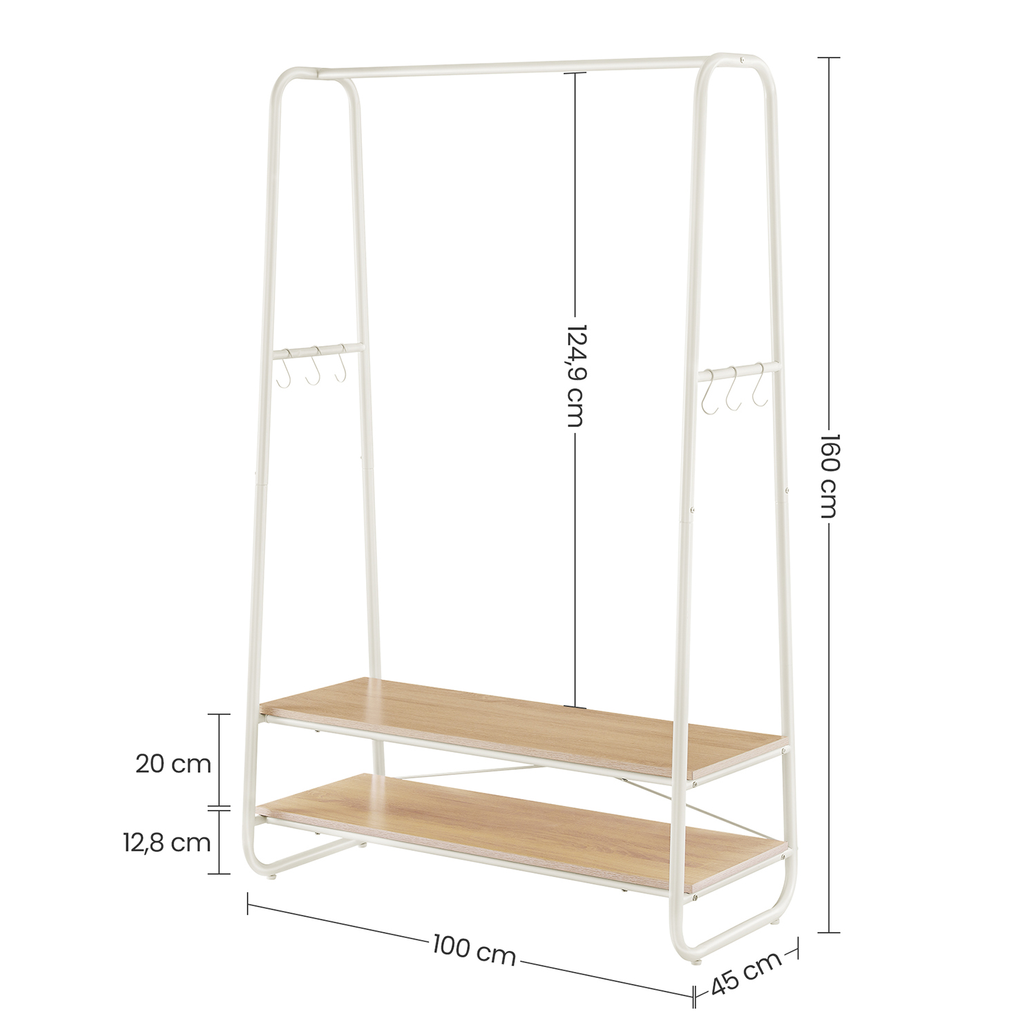 Tøjstativ til i alt 160 kg med tøjstang, 2 hylder og 6 S-kroge - garderobestativ med bøjlestang og 2 skohylder - hvid og brun 100 x 45 x 160 cm