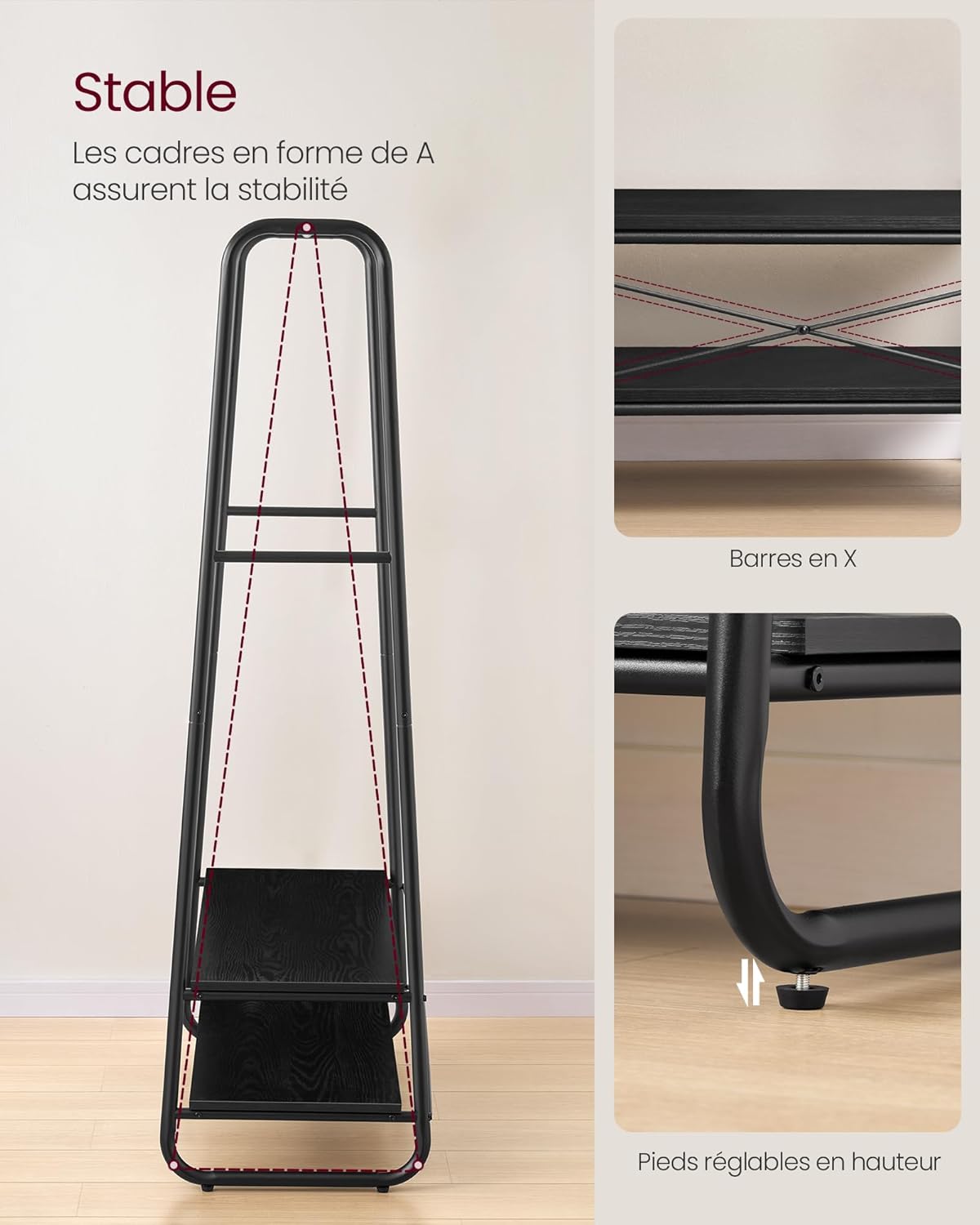 De 2 sorte hylder på garderobestativet kan anvendes som skohylder til sko eller opbevaringshylder til tasker, æsker osv.